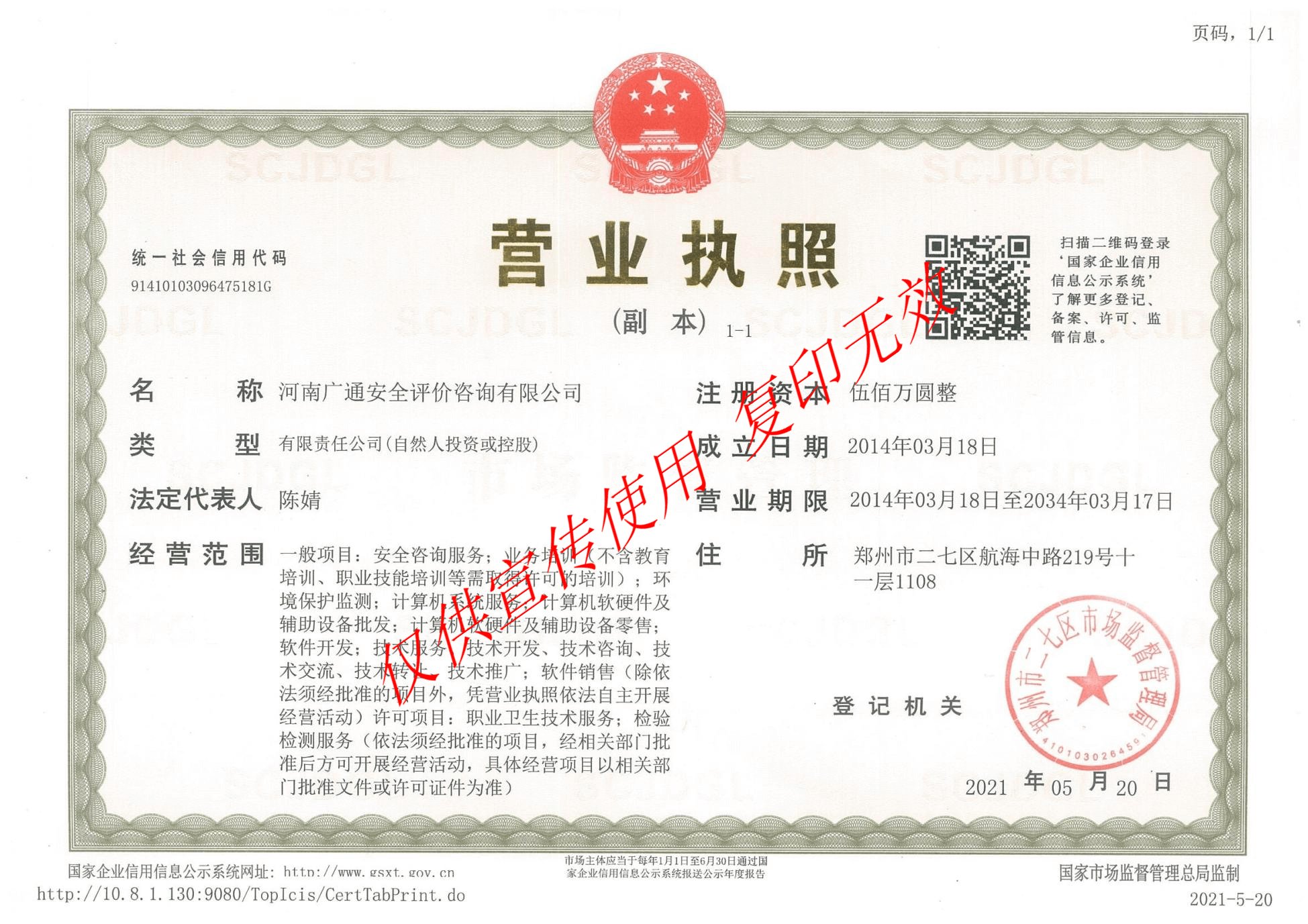 河南广通安全评价咨询有限公司始建于2014年3月,是一家依法登记注册并取得河南省卫健委颁发的职业卫生技术服务机构资质的第三方专业技术服务机构。